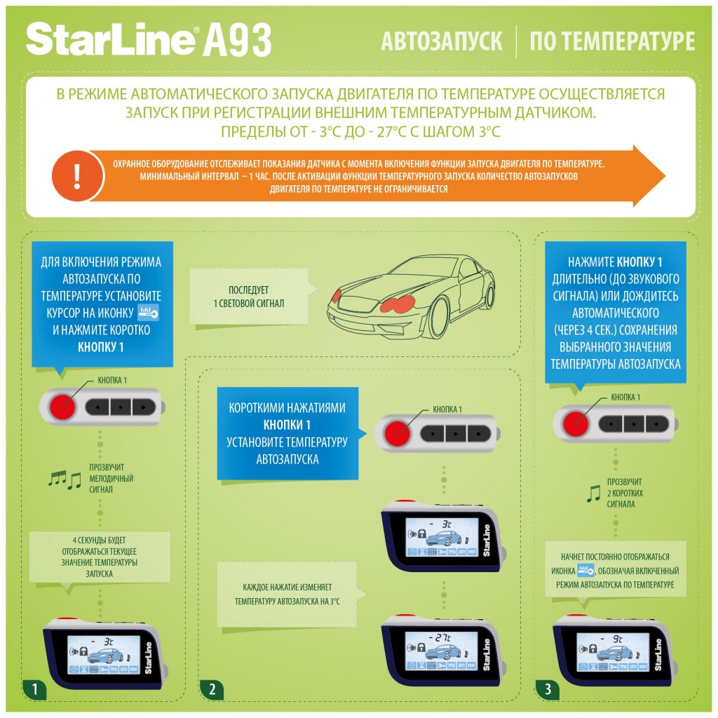 - Выставить по температуре «Старлайн А91» можно, чтобы прогрев двигателя начинался при падении температуры двигателя ниже заданного порога, но не чаще, чем один раз в час.