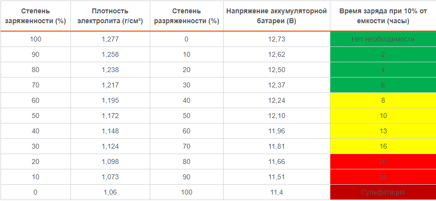 Ниже можно посмотреть таблицу соответствия заряда АКБ плотности электролита.