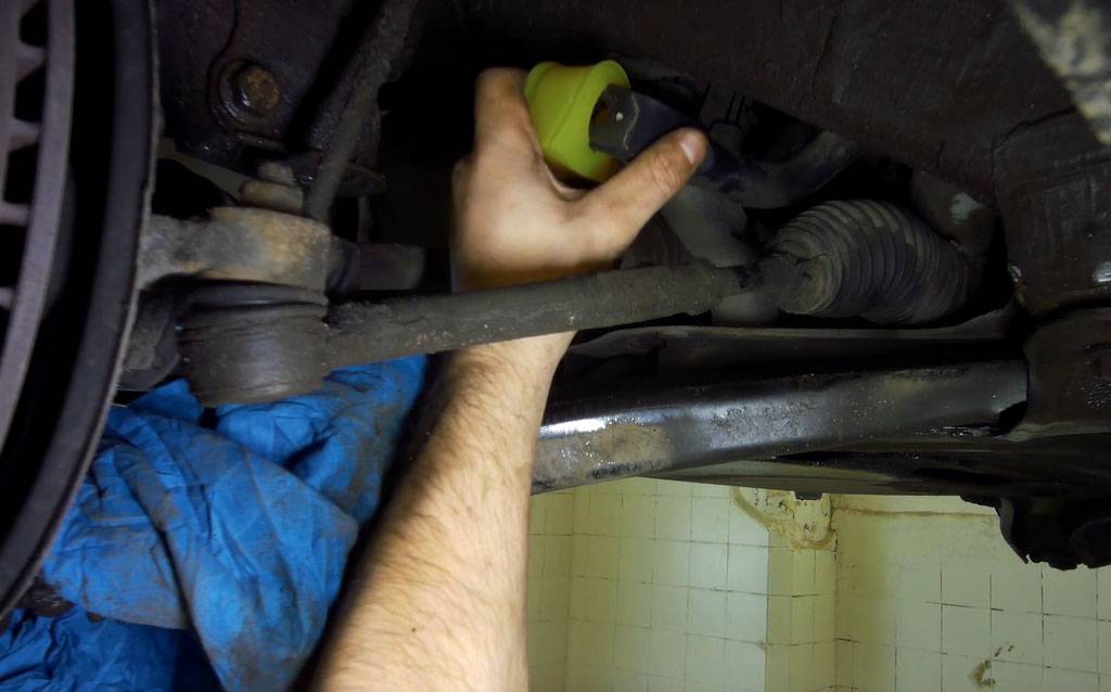 Установка неразрезанной втулки немного сложнее – перед началом работы необходимо отсоединить штангу от колесных узлов. Для этого на обоих концах штанги откручивают гайки шаровых пальцев стоек стабилизатора, и, отсоединив эти стойки, отводят их в сторону.