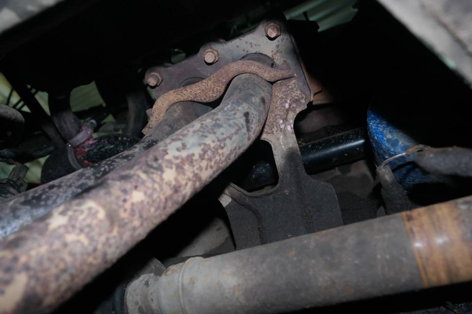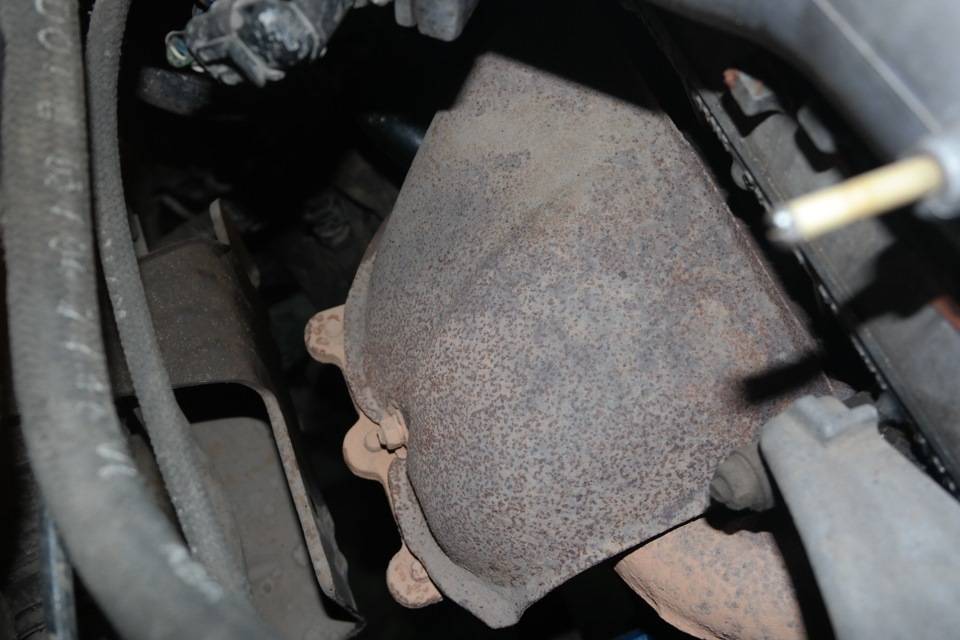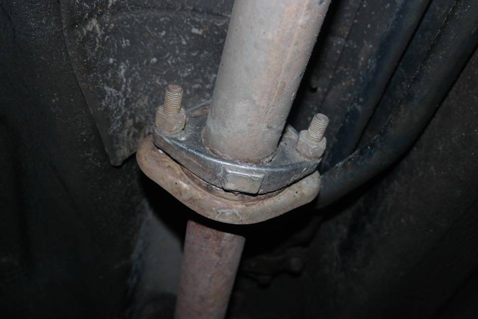 - Внизу выхлопной коллектор крепится к трубе отвода выхлопных газов. Дальше она соединена с выхлопной трубой. Открутить три болта, отсоединить трубу. Удалить коллектор. Откручивать их надо со смотровой ямы, предварительно обстучать головки. Щеткой по металлу очистить гайки и резьбу.