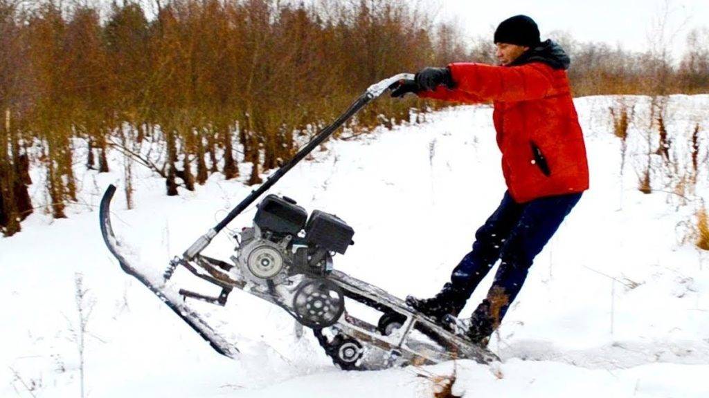 Стоит начать с опоры – установить лыжи под раму. Для облегчения процесса можно использовать снегокат. Затем следует поставить мотор с малой мощностью (примерно 2 лошадиные силы). Его можно извлечь из бензопилы.