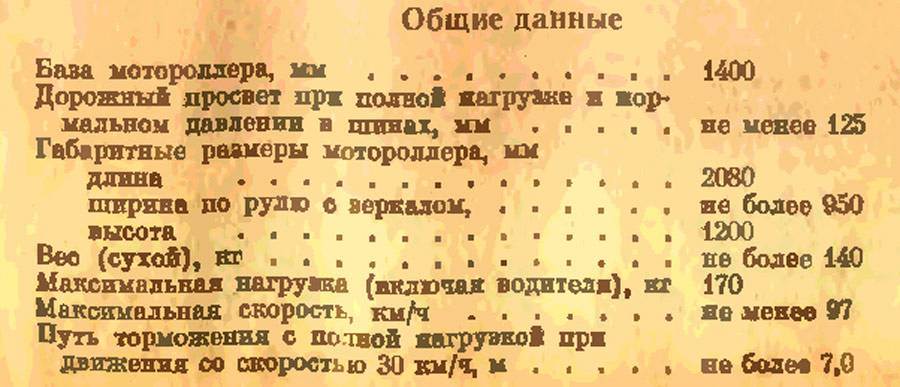 с.), эксплуатация мотороллера с боковым прицепом возможна и на горных дорогах. В самом мотороллере была изменена звёздочка вторичного вала коробки передач; дополнительно введён кикстартер, который позволял заводить двигатель без применения династартера (это особенно важно при неисправной аккумуляторной батарее). Вместе с коляской ширина мотороллера 1455 мм; величина колеи — 1035 мм; вес мотороллера без горючего и инструментов 220 кг
