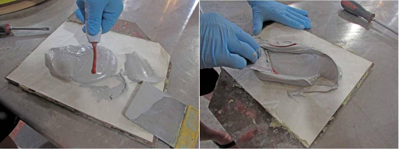На «мольберт» (небольшой лист жести) кладем порцию шпаклевки, добавляем отвердитель и тщательно перемешиваем надавливающими движениями шпателя во избежание появления пузырьков воздуха в смеси.