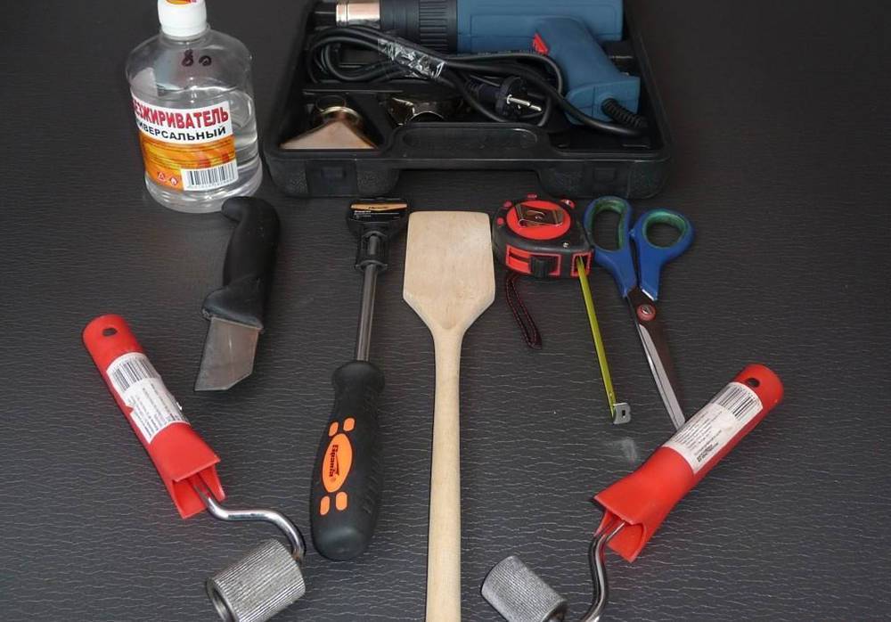Также немаловажно тщательно очистить и обезжирить оклеиваемые поверхности. Для плотного облегания покрытием деталей потребуется разогревать материал феном и прижимать его к полу, разглаживая валиком, шпателем, в наиболее недоступных местах – руками