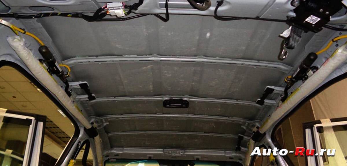 Как на объектах, о которых говорилось ранее, подготовительный процесс начинается своими руками с демонтажа обшивки потолка. Очищаем поверхность от грязи и пыли. Тщательно обрабатываем потолок уайт-спиритом или растворителем. Если в комплектацию автомобиля входила защита её следует удалить.