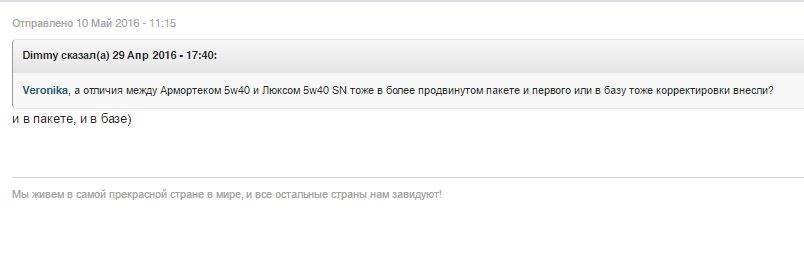Более того, у лукойла есть ещё одно масло…называется оно GENESIS ARMORTECH 5W-40. На упомянутом oil.club’е люди разделились на два лагеря: одни говорят, что это всё тот же Лукойл люкс SN, а другие, что различия есть в базе масла. Представитель лукойла (на форуме есть и такой, а, если точнее, то «такая») говорит, что генезис использует немного другую базу масла и немного другой пакет присадок