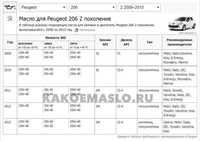 Какое масло заливать в двигатель Peugeot 206?