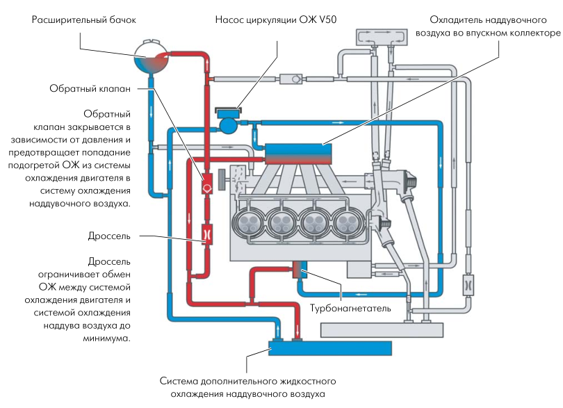 В состав охлаждения наддувочного воздуха входят интеркулер, рециркуляционный насос охлаждающей жидкости V50.