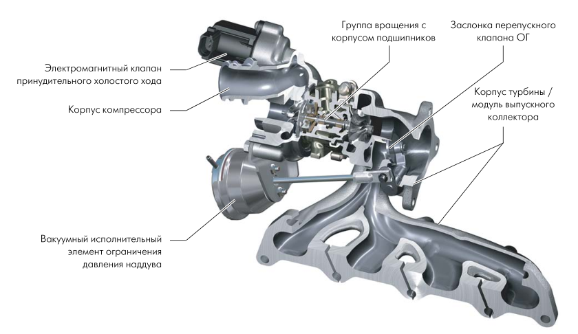 Модуль турбонагнетателя отработавших газов имеет уменьшенную геометрию деталей (колеса турбины и компрессора).