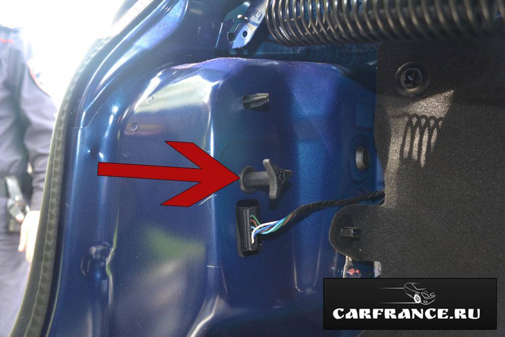 - В первую очередь нужно убрать все лишнее из багажника, чтобы оно не мешало проводить все возможные операции. Также с правой стороны приподнимается обшивка, которая фиксируется пластиковыми крепежами. На данном этапе нужно последовательно отключить проводку, которая идет к правому фонарю, и разобрать его.