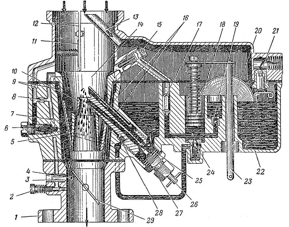 Главная дозирующая система карбюратора работает по принципу регулирования разрежения в диффузоре. Она состоит из главного жиклера 27, распылитель которого выходит в малый диффузор 10, дополнительного жиклера 25, распылитель которого выходит в горловину большого диффузора 14, и автоматического перепускного воздушного клапана, состоящего из четырех упругих пластин 5.