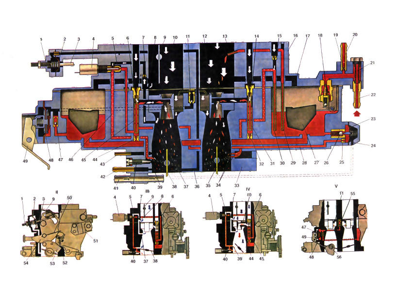 При впуске давление в цилиндрах уменьшается. Воздух из окружающей среды поступает в цилиндр через смесительную камеру 8, где расположен диффузор 6 (трубка Вентури), и впускной трубопровод, который распределяет готовую смесь по цилиндрам.