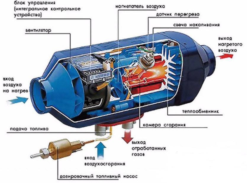 Воздушный обогреватель представляет собой дополнительный отопитель. Главным образом он используется для прогрева салона. Внутри находится камера сгорания, куда поступает топливо при помощи топливного насоса и форсунки. Насос подключается к аккумулятору автомобиля. Смесь воспламеняется при помощи свечи. Для обеспечения процесса горения нагнетатель подает воздух извне. Проходя через разогретую камеру сгорания и дополнительный теплообменник, воздух нагревается и подается в салон автомобиля. Отработанные газы отводятся наружу. Это достаточно простая и надежная конструкция. Для прогрева используется гораздо меньше топлива, чем было бы потрачено двигателем.