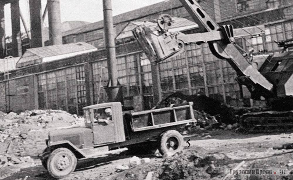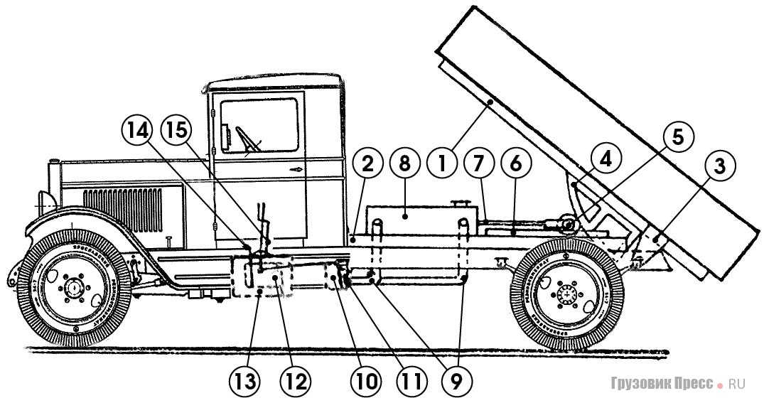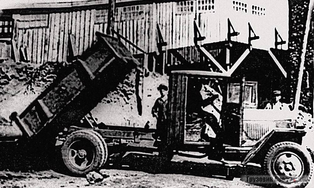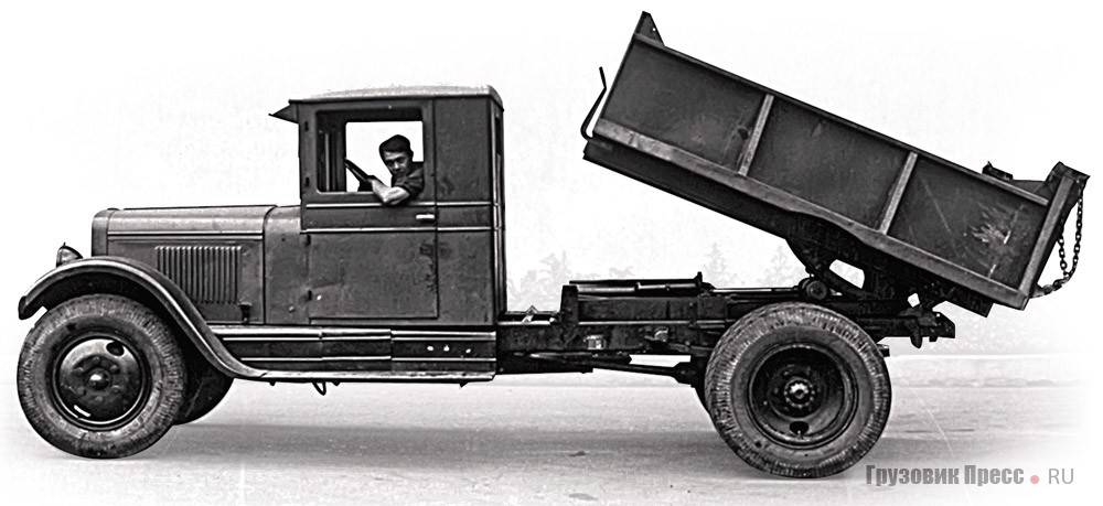 Уже с 1935 г. Механический завод строительства канала Москва – Волга (МВС) наладил мелкосерийный выпуск самосвалов с горизонтальным гидроцилиндром для подъёма самосвального кузова. Шестерёнчатый масляный насос получал крутящий момент от коробки отбора мощности (КОМ), смонтированной на правом боку коробки передач (КП), и через маслопровод нагнетал масло в цилиндр, неподвижно закреплённый на раме. В результате шток поршня цилиндра через траверсу-тележку с опорными роликами, двигавшуюся по направляющим рельсам, давил парой напорных роликов на два полусегмента у днища, которые, поднимаясь, опрокидывали кузов. Подача масла регулировалась перепускным вентилем, который в открытом состоянии соединял нагнетательный и всасывающий каналы маслопровода. Движение поршня продолжалось до тех пор, пока он, дойдя до конца цилиндра, не открывал высверленное сбоку выпускное отверстие во всасывающий канал маслопровода. И так как давление переставало увеличиваться, дальнейший подъём (на уровне 50°) прекращался. Спуск происходил под действием собственного веса платформы, но также мог замедляться перепускным вентилем. У поршня имелся кожаный «воротник» для предотвращения утечки масла, так как давление в системе доходило до 25 кг/cм2. Управление осуществлялось прямо из кабины двумя рычагами: включения КОМ и управления вентилем.