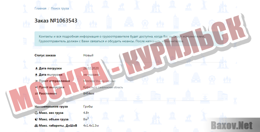 Тут первый пердимонокль встречаем. Для поиска нужно ввести город отправления и прибытия. Какие бы комбинации вы не выбирали, заказов – множество. Даже можно взять заказ на перевозку груза автомобилем из Москвы в Курильск. Да-да, в тот, что на острове Итуруп. И заказов по этому маршруту достаточно – больше пятидесяти. Вот, например, грибы надо отвезти. Машиной, да.