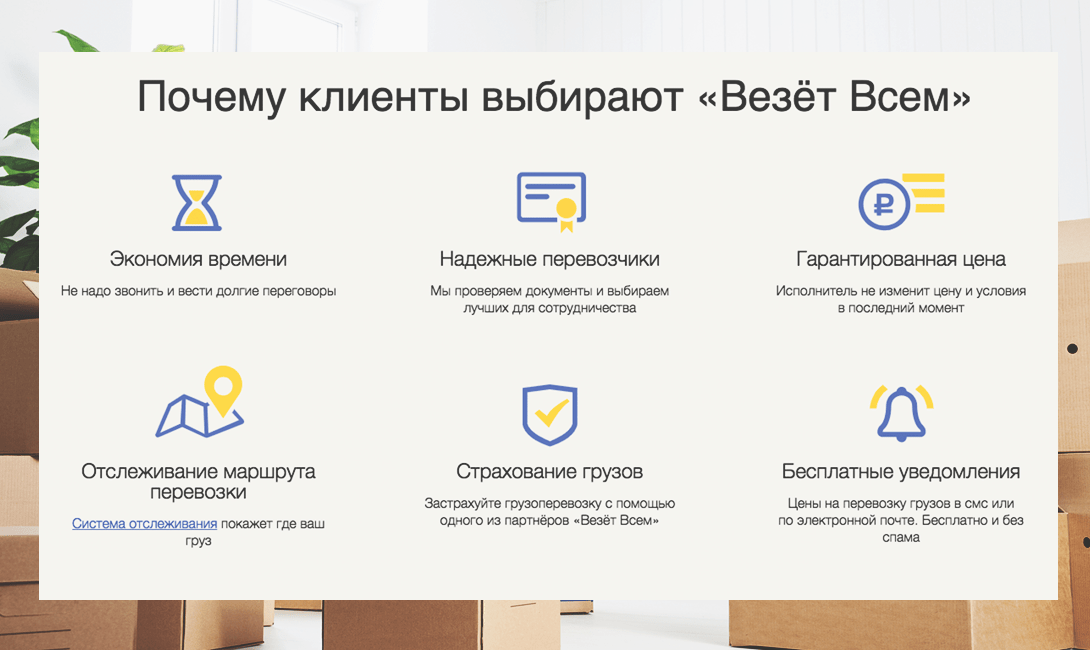 Уникальным торговым предложением «Везём Всем» является то, что не ты ищешь варианты перевозок, а компании торгуются за возможность взять твой заказ. Ты размещаешь свой запрос о перевозке на сайте, подробно описывая габариты, особенности, сроки и расстояние. После чего компании аукционным методом пытаются перехватить у конкурентов твой запрос, предлагая цену ниже. По статистике сайта, это может помочь сэкономить до 72 % от изначальной суммы.