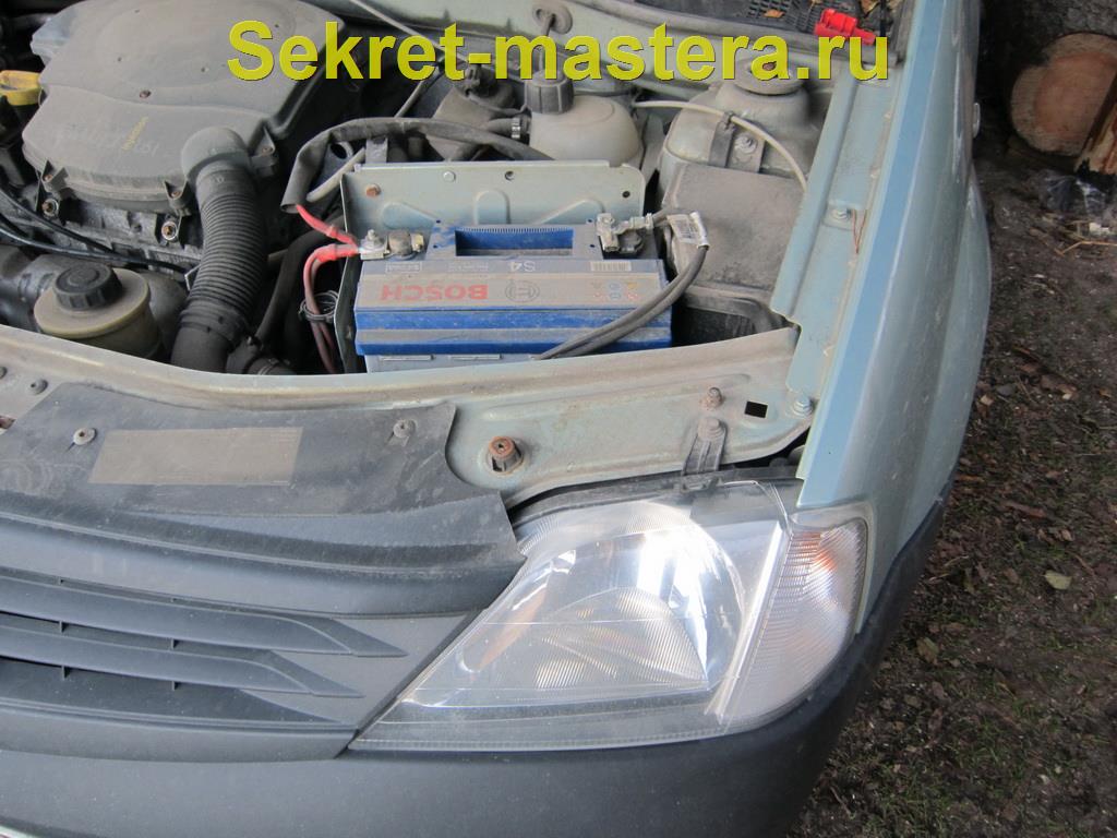 Итак, открываем капот, просовываем руку между аккумулятором и кузовом Рено Логана (правая фара) и нащупываем крышку. Если рука не пролезает, то батарею можно демонтировать. К примеру, я справился без снятия аккумулятора.