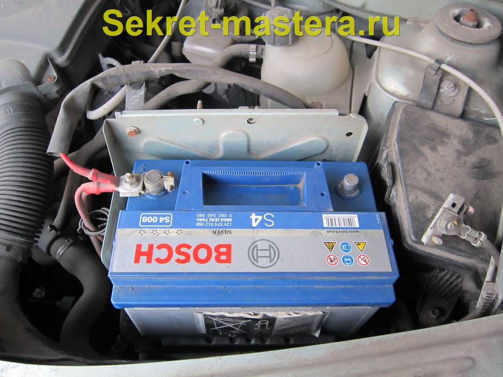 Осторожно вынимаем планку с винтом, чтобы она не упала в капот. Вынимаем аккумулятор из капота