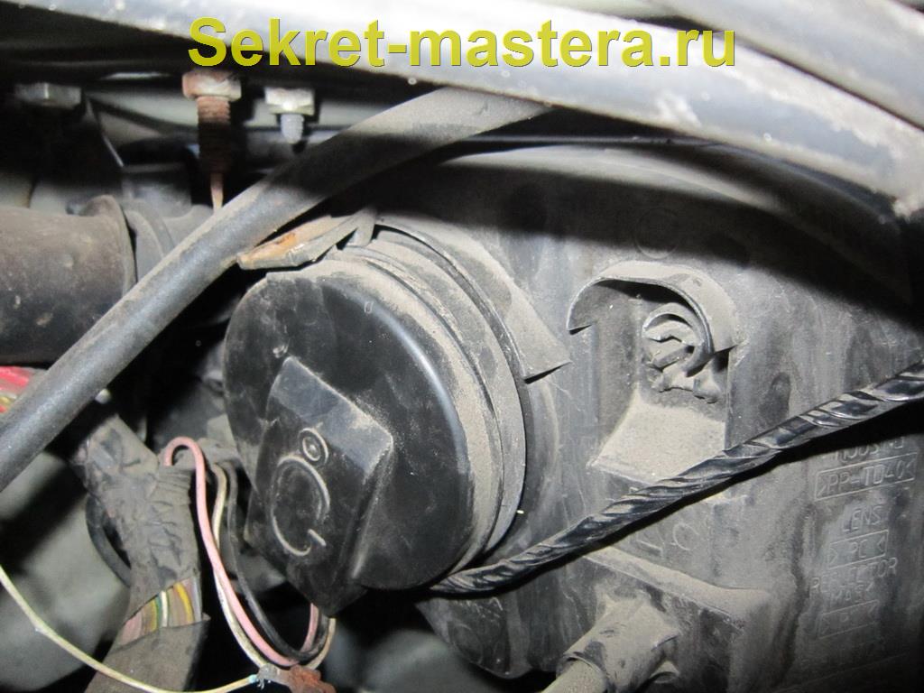Чтобы поменять лампочку ближнего света в машине второго поколения, надо знать ее расположение. Посадочное место для нее показано стрелкой на фото.