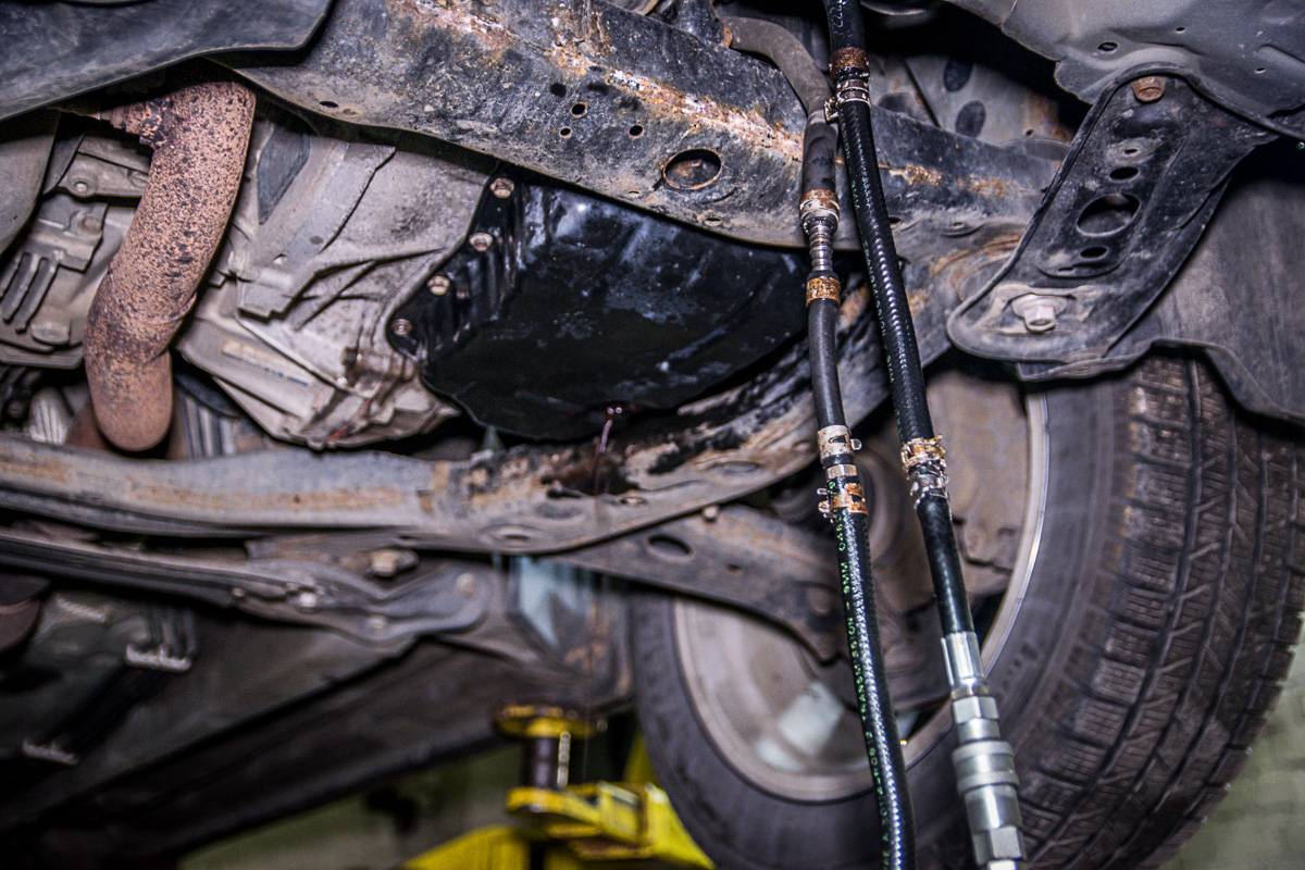 Как выполняется данная операция? Сперва машина загоняется в бокс и устанавливается на подъемник. Далее специалисты демонтируют поддон автоматической трансмиссии, предварительно слив масло. Затем поддон очищают от всех загрязнений и продуктов износа. Далее элемент устанавливается на место. После производится подключение аппарата к трубопроводам, что идут на радиатор охлаждения масла. В аппарат уже залита новая жидкость в полном объеме. Нужно сказать, что количество ее немного больше заправочного объема, примерно на два литра.