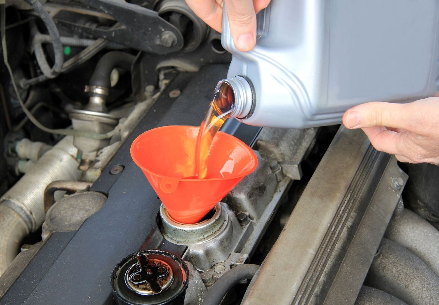 Далее нужно открыть пробку заливной горловины, чтобы начать вливать моторную жидкость;