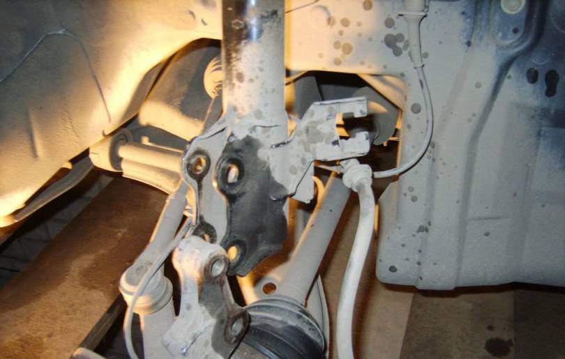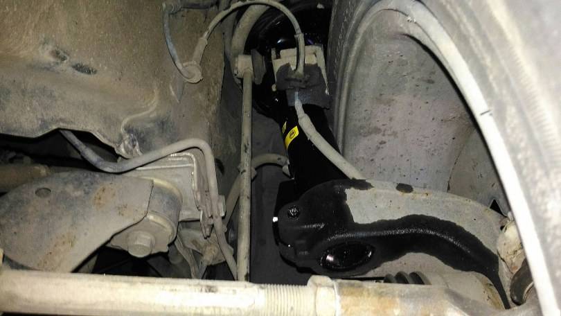 - Открутить гайки и вытащить болты, крепящие амортизатор. Если мешает колесо, то необходимо демонтировать его. Отсоединить от тормозного шланга и провода датчика ABS (если прикреплены) амортизатор и вытащить его