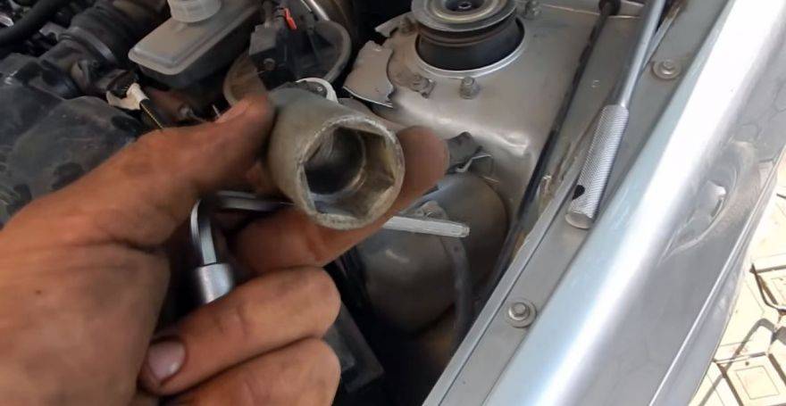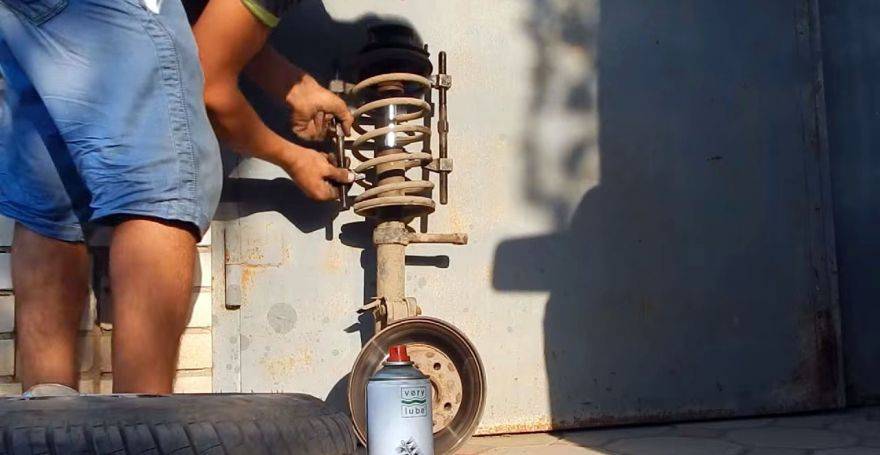 Вот и снят весь модуль передней подвески. Чтобы его разобрать, нам понадобятся стяжки пружин и специальный ключ для откручивания центральной гайки сверху опоры. Первым делом необходимо ослабить верхнюю гайку, удерживая шток от проворачивания: