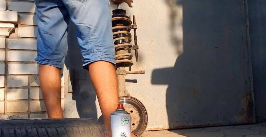 - Смажьте болт снизу, фиксирующий заднюю стойку, специальной смазкой. Для этого можно воспользоваться спреем WD-40. Рожковым ключом надо фиксировать гайку, а другим ключом аналогичного размера необходимо раскручивать болт.