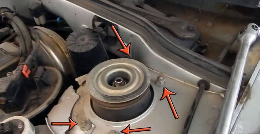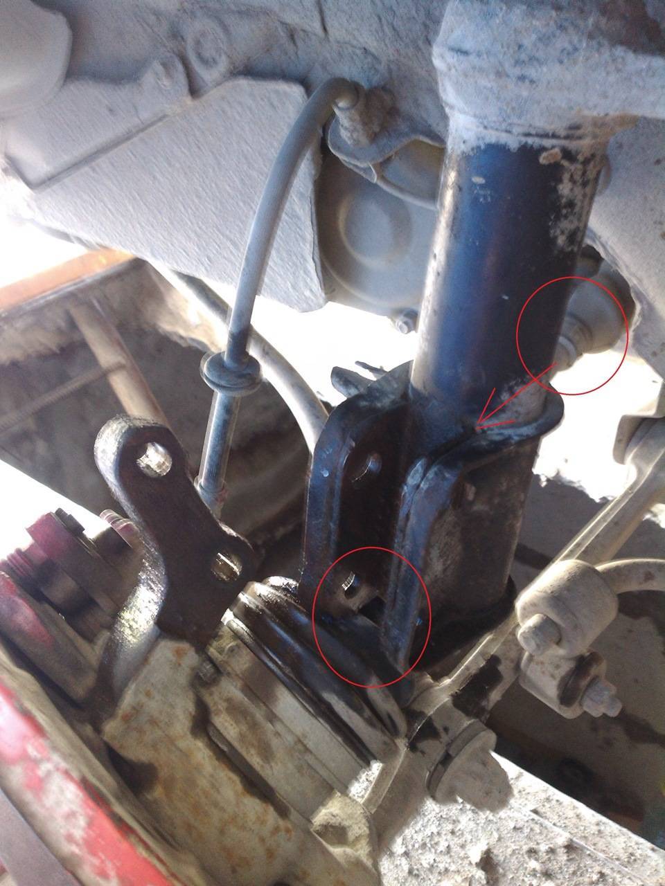 - Используя 19-мм ключ и торцевую головку, открутите нижний и верхний болты крепления амортизатора к поворотному кулаку.