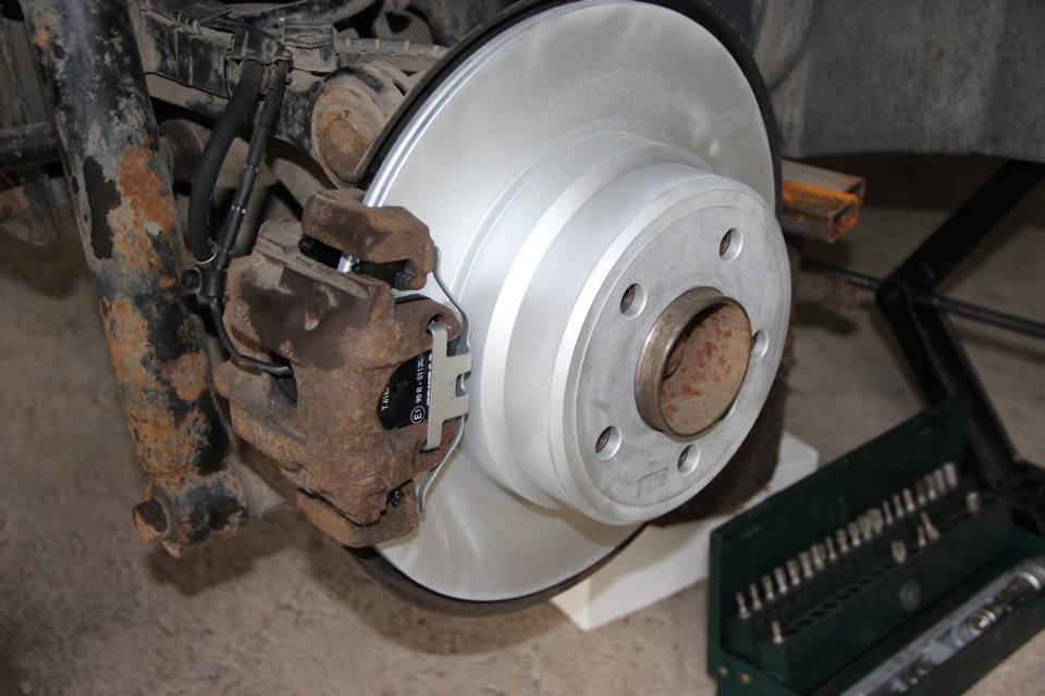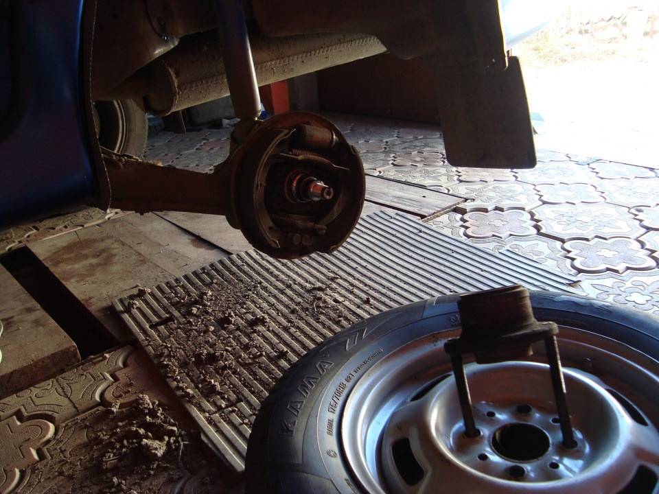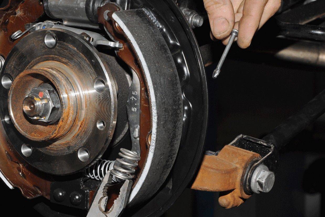 Снимите клемму отрицательного полюса аккумулятора. Снимите декоративную литую крышку диска, а затем открутите болты, которыми колесо крепится к ступице. Соедините колодки через отверстие в барабане, а затем открутите 2 фиксирующих винта. Снимите барабан, отсоедините возвратные пружины и регулятор зазора. Для удаления продуктов износа используется металлическая щетка, окисленные элементы обрабатываются жидкостью WD40. Снимите тормозные колодки, установленные на направляющих штифтах, которые можно снять через отверстия в тормозном щите