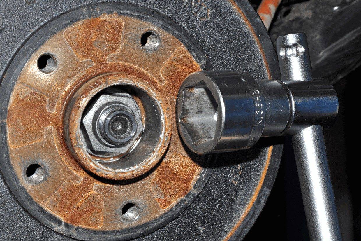 Демонтируйте барабан и отпустите зажим гайки ступицы, а также болтов крепления колеса. Задние тормозные колодки демонтировать не обязательно.
