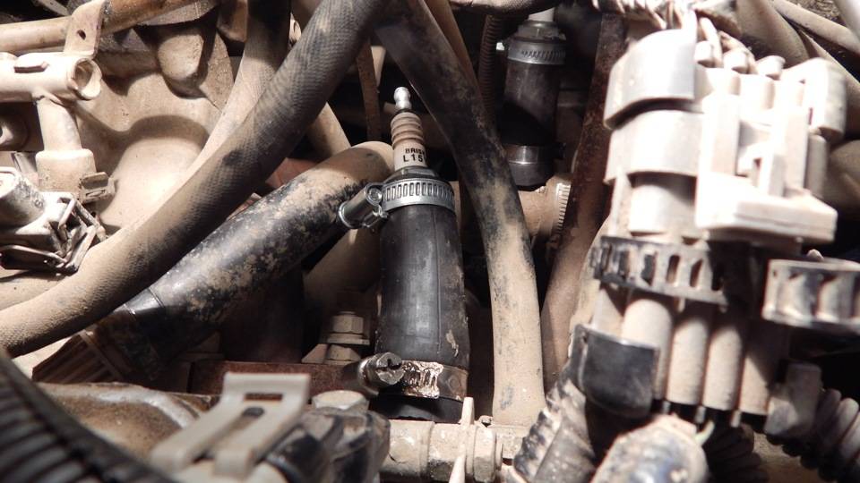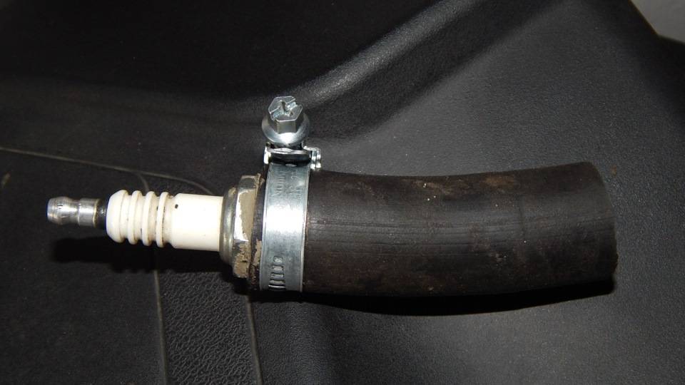В моторном отсеке отсоединил шланги печки от двигателя, а патрубки заглушил отрезками шланга с заглушками. В качестве заглушек применил старые свечи зажигания, юбка которых точно подошла по диаметру.