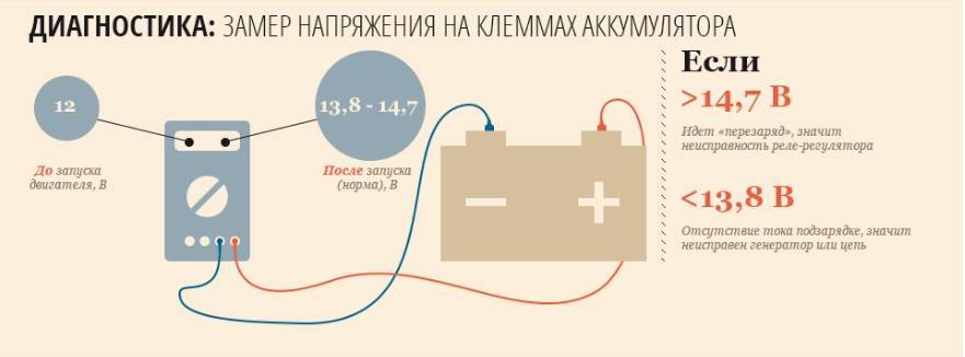 3. Через 15 мин работы двигателя на средних оборотах замерьте напряжение, оно должно быть в пределах 13,8–14,4 В.