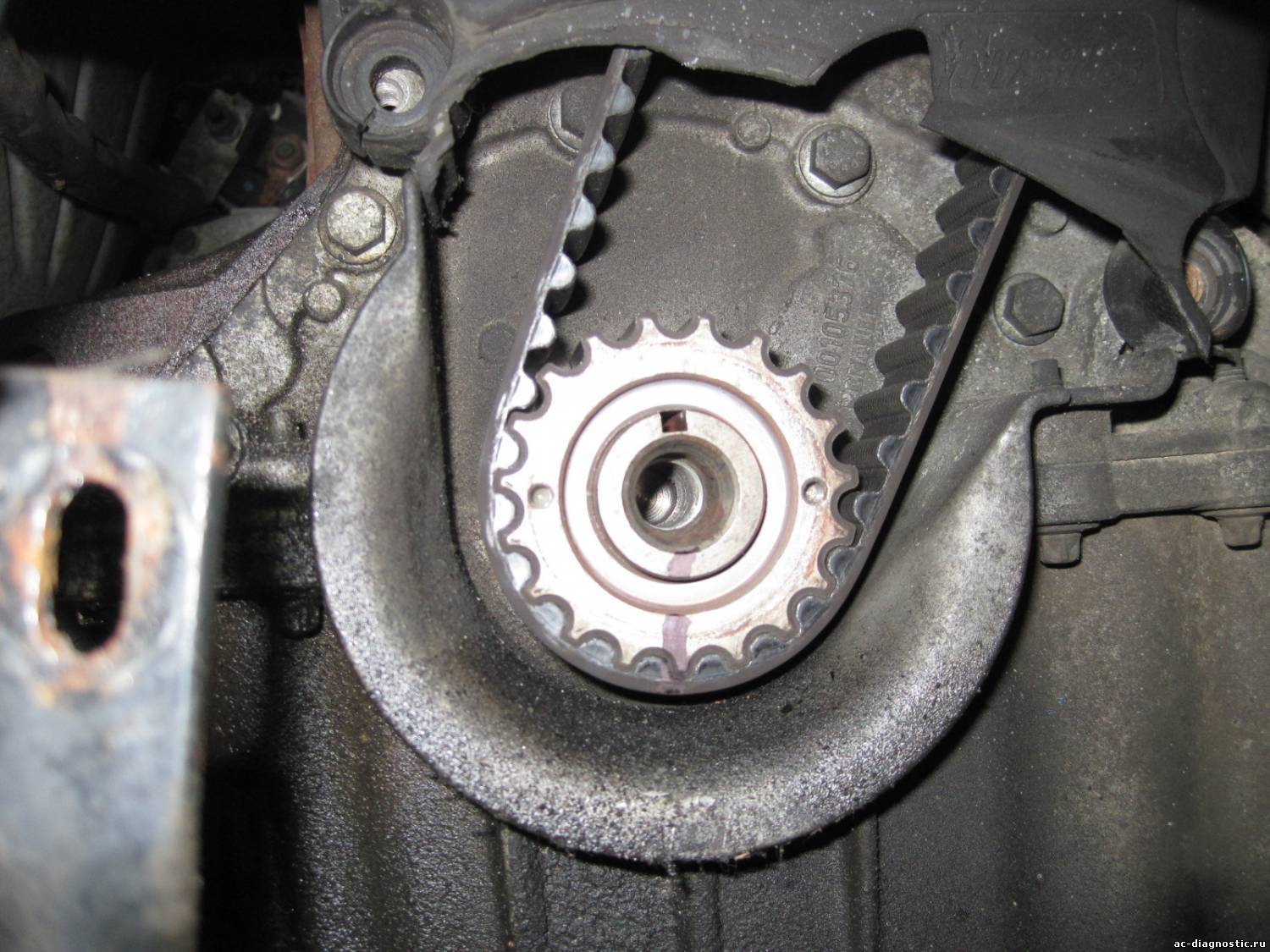 По расхождению черных меток видно, что ремень убежал практически на один зуб. Возвращаем все на место и делаем метку коленвала на моховике, под машиной со стороны КПП. Коленвал должен упрется в фиксатор и риска на указателе ВМТ должна быть в крайнем верхнем положении, на распредвалы пока не смотрим. Вынимаем фиксатор, чтобы его не повредить. Откручиваем болт коленвала, предварительно зафиксировав подходящим инструментом как заменить ремень грм на рено симбол.