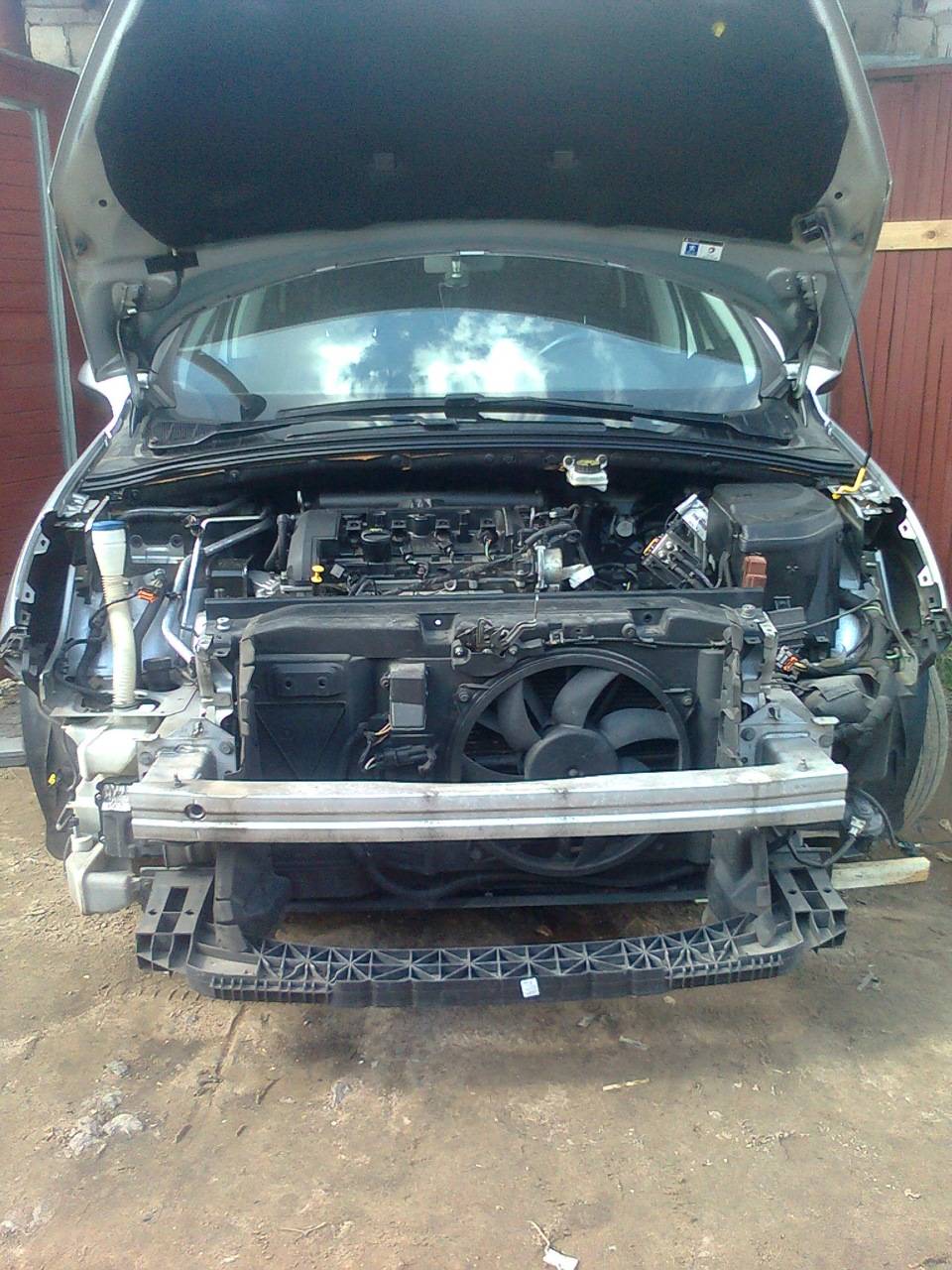 Вход в патрубок от помпы куда вставляется переход термостата. Видно, что и тут накипь.Глядя на всю, открывшуюся картину, было принято решение о замене антифриза и промывке системы охлаждения.Сначала сливаем старый антифриз. Затем снимаем радиатор. Чтобы снять радиатор в нашем случае придется разобрать весь перед машины вот до такого состояния: