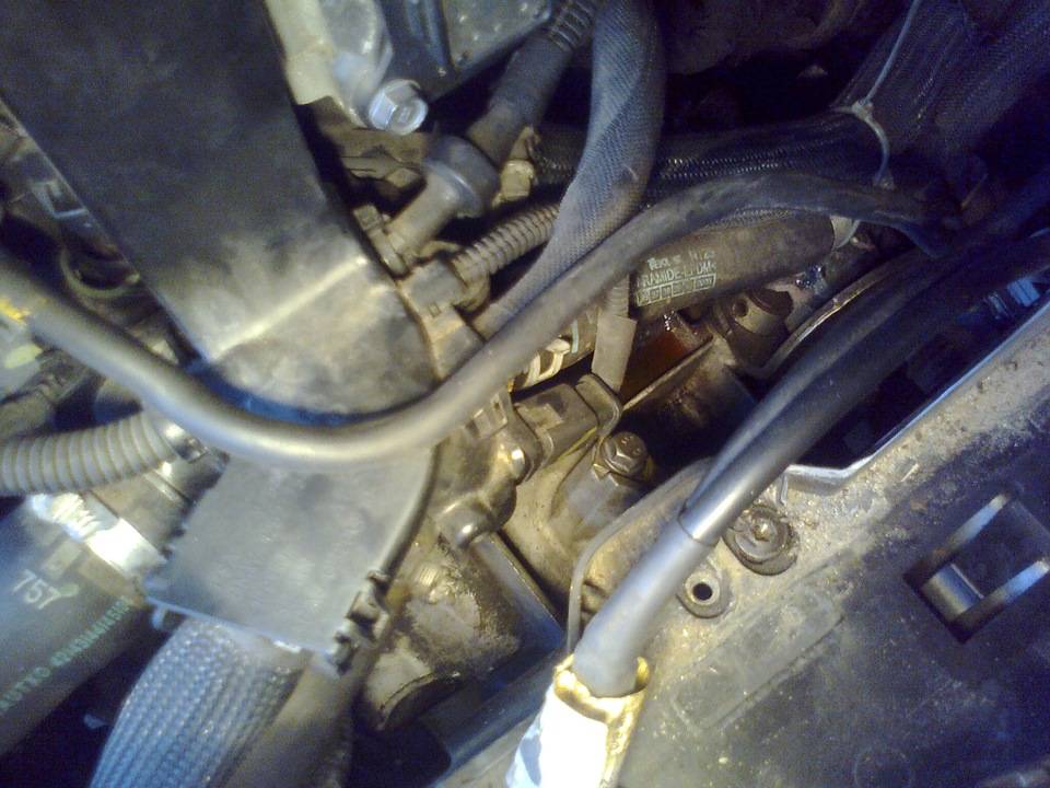 Однако если Вы наблюдаете в работе двигателя постоянные утечки жидкости, то нужно продолжить демонтаж дальше. Сам термостат снимается довольно легко: откручиваем на его корпусе кронштейн крепления воздухофильтра и отсоединяем датчик температуры. После этого сливаем охлаждающую жидкость. Затем нужно открутить 4 болта термостата, 2 трубки и извлечь термостат.