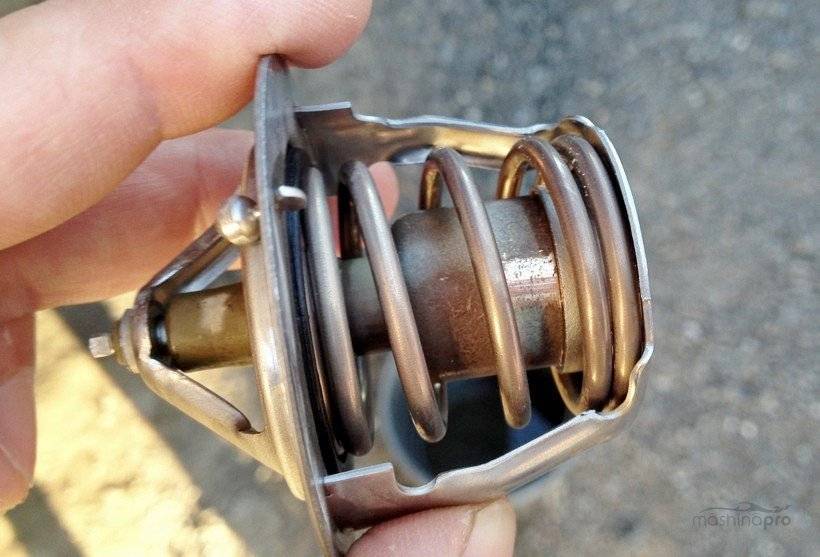 Основным рабочим элементом самого клапана, находящегося внутри термостата, является твердый термочувствительный наполнитель, который при нагревании, через резиновую вставку, воздействует на поршень, перемещающий основной клапан. Нагреваясь он открывает его, остывая, наоборот закрывает отверстие, не допуская протока тосола.