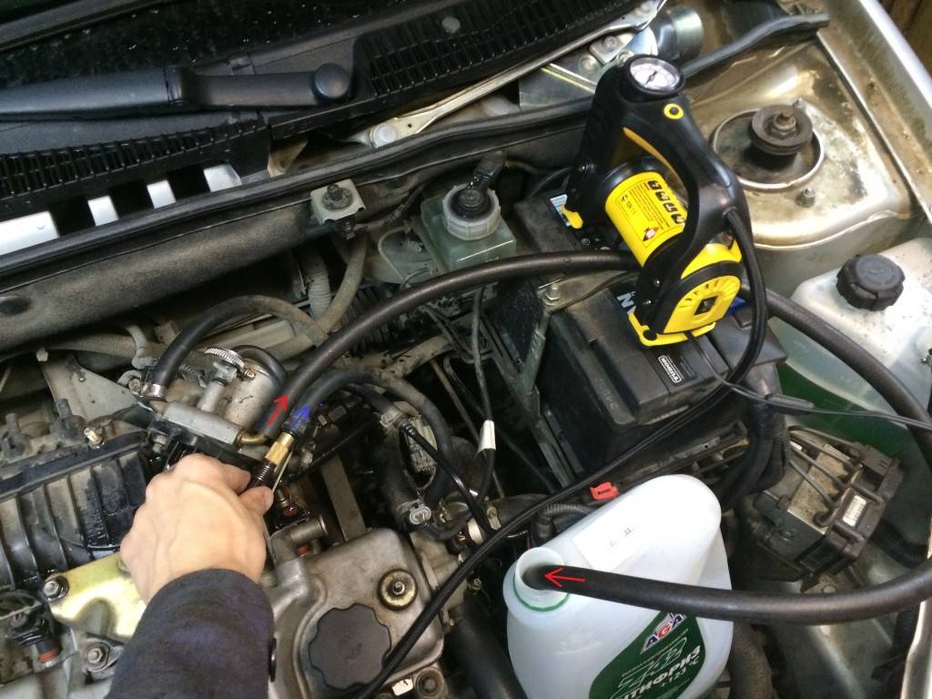 Затем нам понадобиться компрессор, предварительно подключенный к прикуривателю или клеммам аккумулятора в зависимости от типа проводов. После чего накручиваем конусообразную насадку на конец компрессора и засовываем в шланг подвода жидкости к дроссельному узлу (отмечено синей стрелкой), а на штуцер дроссельного узла надеваем похожий по размеру шланг, а другой конец пойдет в канистру с остатками старого антифриза.