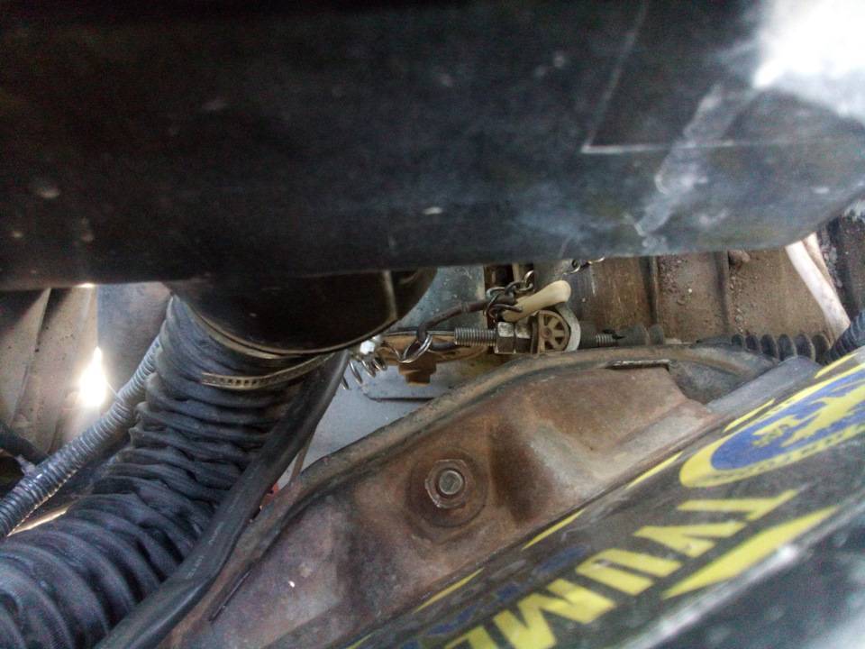 - Откройте капот и найдите конец тросика педали. Он виден хорошо, поэтому его поиск не займет много времени. При помощи гаечного ключа ослабьте фиксирующую гайку, крепящую тросик к рычагу, а вторую гайку затяните. Делайте это до тех пор, пока свободный ход педали будет в диапазоне от 125 до 135 мм.