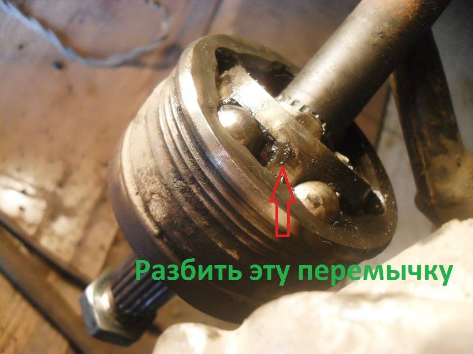 Затем его выворачивают наружу или просто сдвигают, чтобы не мешал. Далее, придерживая одной рукой шлицевую часть гранаты, изнутри по ее краю наносят несильные удары молотком. В том случае, когда граната подлежит замене, беспокоиться особо нечего, можно смело бить, пока она не сойдет со шлицов вала. Пыльник, на котором обнаружены дефекты, выворачивается обратно, ослабляется второй хомут и деталь снимается с вала. Внутренний ШРУС разбирается точно таким же образом, как и внешний, только надо зажать вал в тисках около самой гранаты.
