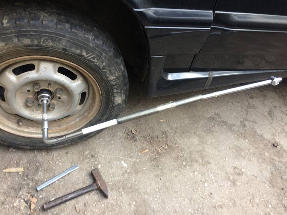 - Первым делом срываем болты крепления с колеса и ступичную гайку, затем выставляем противооткатные упоры под задние колёса. (Для того, чтобы легче было сорвать гайки, лучше использовать удлинитель для воротка – прим.).