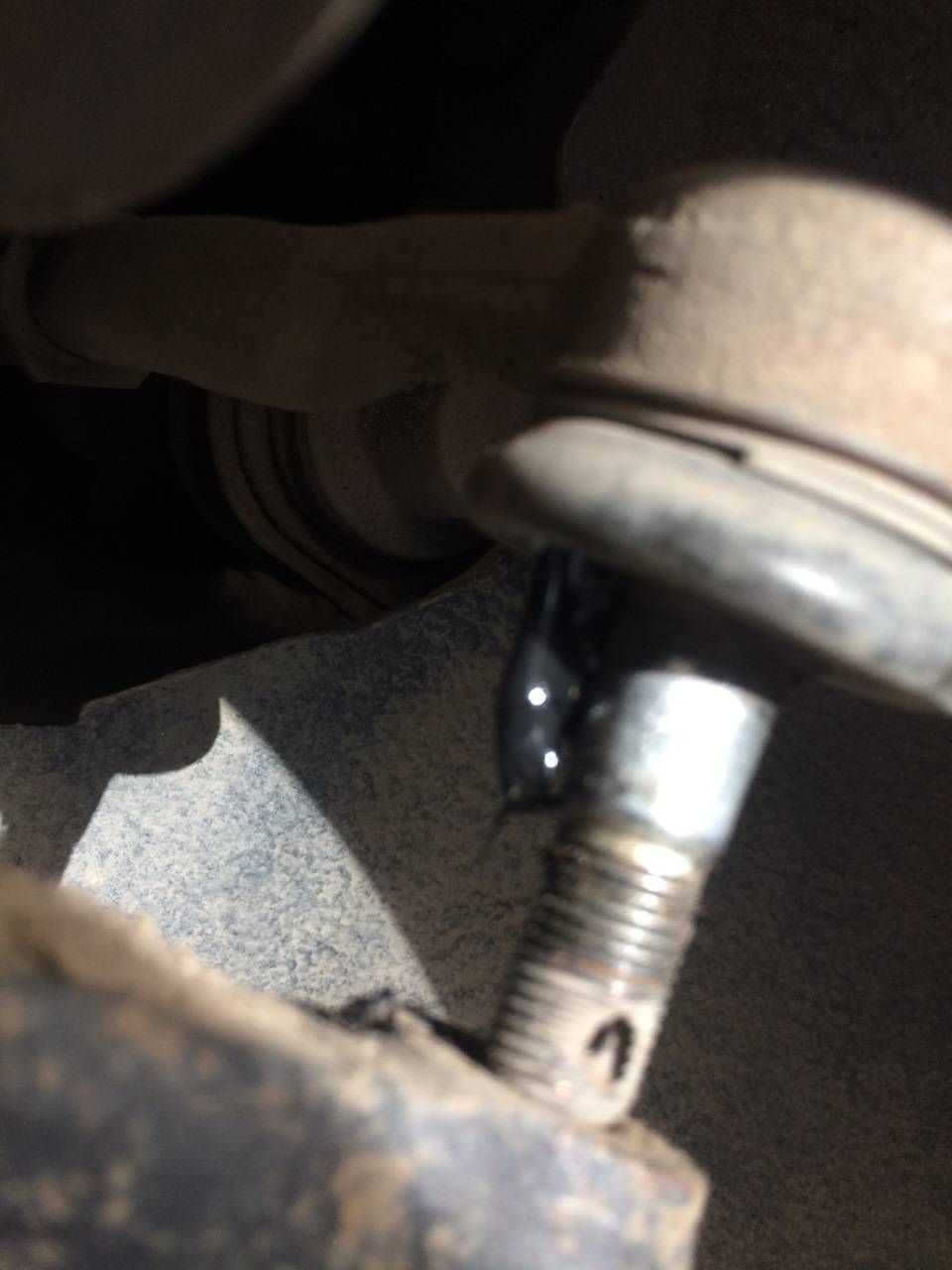 - Теперь, когда перед вами предстала такая картина, осталось лишь открутить 2 болта, которые крепят шаровую к поворотному кулаку. Отмеченные красным маркером болты выкручиваем с двух сторон.