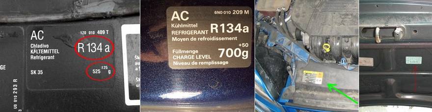 Чтобы знать точно, какую марку использовать, надо заглянуть под капот, где обычно приклеена таблица с информацией об используемом хладагенте. При ее отсутствии информацию следует искать в инструкции автомобиля.